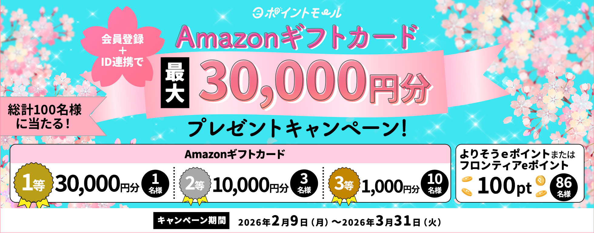 期間内にキャンペーン対象条件を満たしたお客さまの中から、抽選で「Amazonギフトカード30,000円分」を1名様に、「Amazonギフトカード10,000円分」を3名様に、「Amazonギフトカード1,000円分」を10名様に、「よりそうeポイントまたはフロンティアeポイント100pt分」を86名様にプレゼントいたします。賞品はご選択いただけません。キャンペーン期間中にアンケートコーナーを初めて利用されたお客さまは、当選確率2倍とさせていただきます。