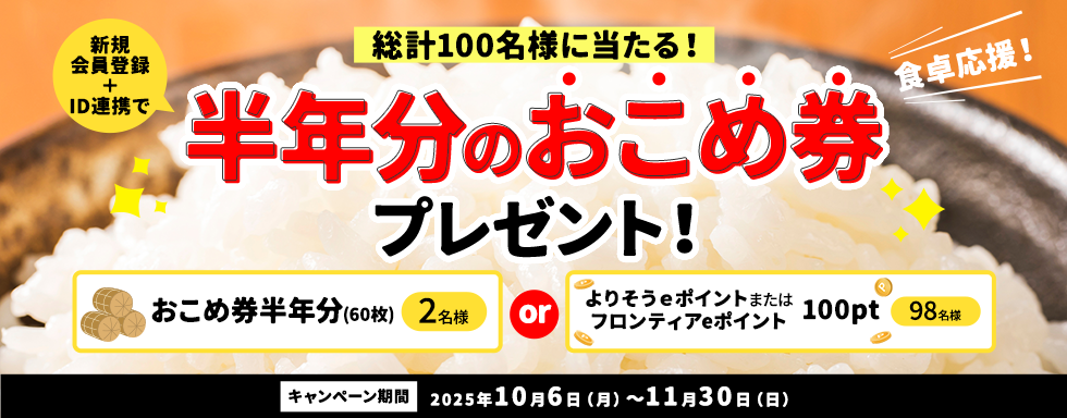 期間内にキャンペーン対象条件を満たしたお客さまの中から、抽選で「全国共通おこめ券」60枚分を2名様に、「よりそうeポイントまたはフロンティアeポイント100pt分」を98名様にプレゼントいたします。賞品はご選択いただけません。キャンペーン期間中にアンケートコーナーを初めて利用されたお客さまは、当選確率2倍とさせていただきます。